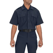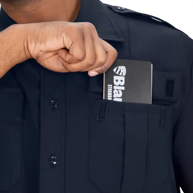 Blauer’s FlexPro Short Sleeve Shirt sets a new benchmark for what a Class A uniform shirt can be—professional and sharp-looking on the outside, unbelievably flexible and comfortable underneath. Woven from our FlexPro performance polyester with built-in stretch, this shirt moves with you without losing its crisp appearance. The modern fabric is enhanced with moisture management and anti-odor tech to keep you cool and dry in the heat of a shift while details like pleated pockets with scalloped flaps, pen slots, a banded dress collar, badge eyelets with internal support strap, and a zippered front with mock buttons keep the uniform presentation tight and inspection ready. Extra-long shirttails stay tucked no matter the movement. Easy-care and machine washable, the men's FlexPro Short Sleeve Shirt brings new energy to the Class A standard—delivering duty-ready comfort and performance with a command presence look.