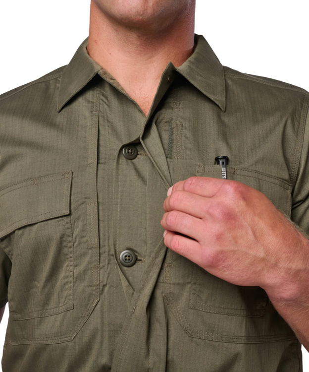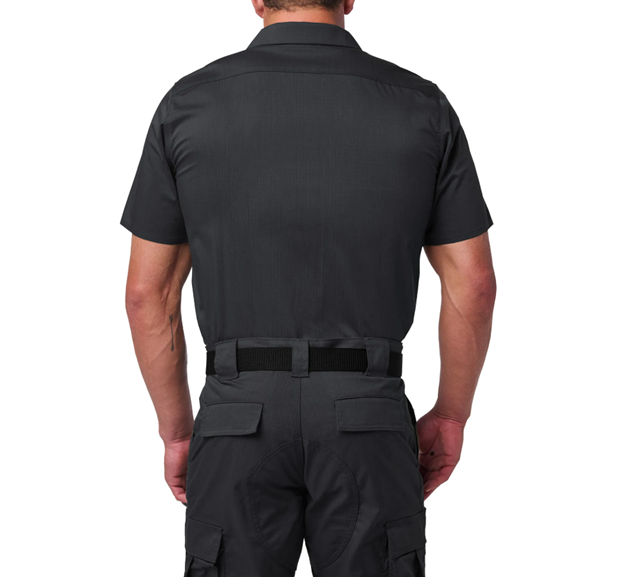 Now available in 5.11's Flex-Tac® mechanical stretch fabric, the TDU® shirt offers time-tested performance and utility for tactical duty uniforms. ReadyPocket™ at left and right chest, double-layered rear yoke and mic cord pass through. The Flex-Tac TDU shirts feature melamine buttons behind a center front placket and include epaulette and badge tab kits packaged with the product. Imported.