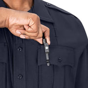 Vertical mic tab on front placket, 2 pleated Napoleon pockets on chest, pen slot