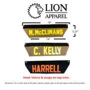 For Innotex, Lakeland, or any custom name plate specify the dimensions of top, bottom and height of the name panel. Please also specify exact snap and/or Velcro placements. Providing images to further specify your name panel needs is greatly appreciated.