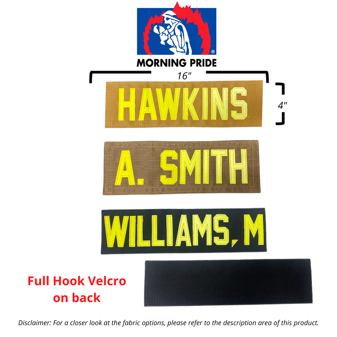 The Morning Pride patch measures 16" X 4” with Velcro covering the entirety of the back. If your name panel requires snaps and is rectangular in shape, please refer to the "Other" style option.
